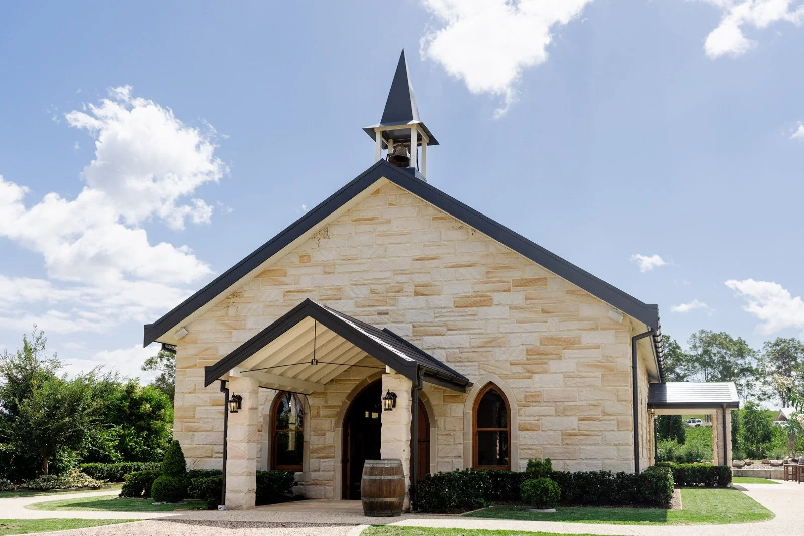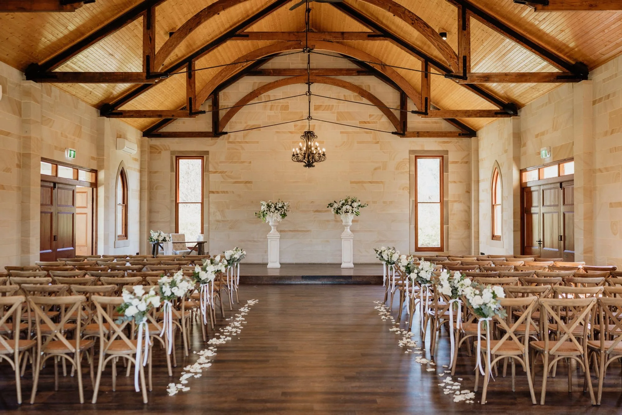 The chapel at Peterson House is one of the few purpose-built ceremony spaces in the Valley. It's got a warm, intimate feel with high timber ceilings, sandstone walls, and beautiful arched windows. It photographs like a dream—especially when that afternoon light filters through the side windows.